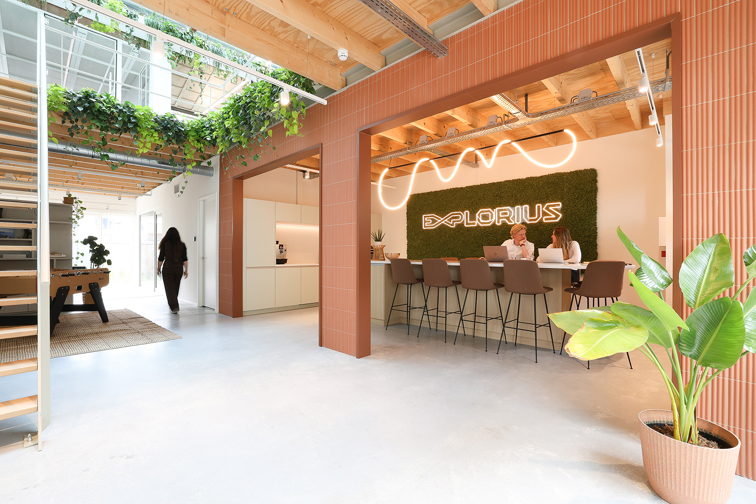 Het ontwerp richt zich op een balans tussen openheid en geborgenheid. In verschillende zones, van een levendige ontvangst met bar tot stille focusruimtes is ruimte gecreëerd voor ontmoeting, overleg en rust. Groen speelt hierbij een centrale rol: strategisch geplaatste planten versterken het comfort, verbeteren akoestiek en dragen bij aan het ‘huiskamergevoel’ dat Explorius voor ogen had. Opvallend is de modulaire meetingbox op de vide, zorgvuldig geïntegreerd in de bestaande structuur, en omringd met groen voor extra privacy.